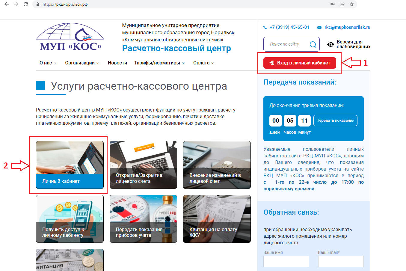 Войти в личный кабинет можно с помощью нажатия кнопок 1 - «Вход в личный кабинет» или 2 - «Личный кабинет»: