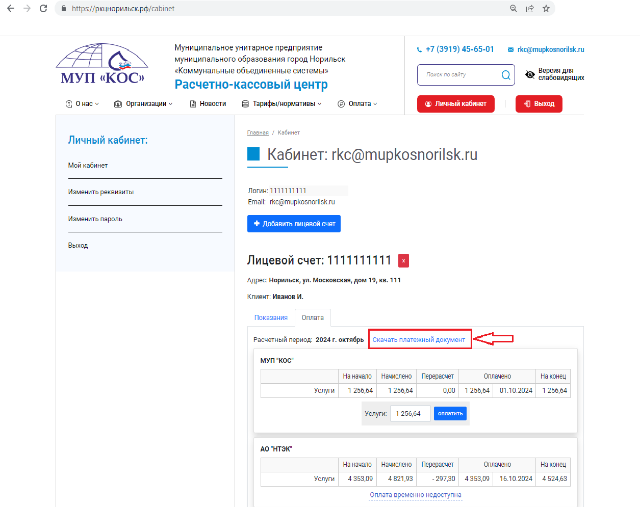 Для того чтобы просмотреть единый платежный документ нажмите на ссылку «Скачать платежный документ» рядом с наименованием расчетного