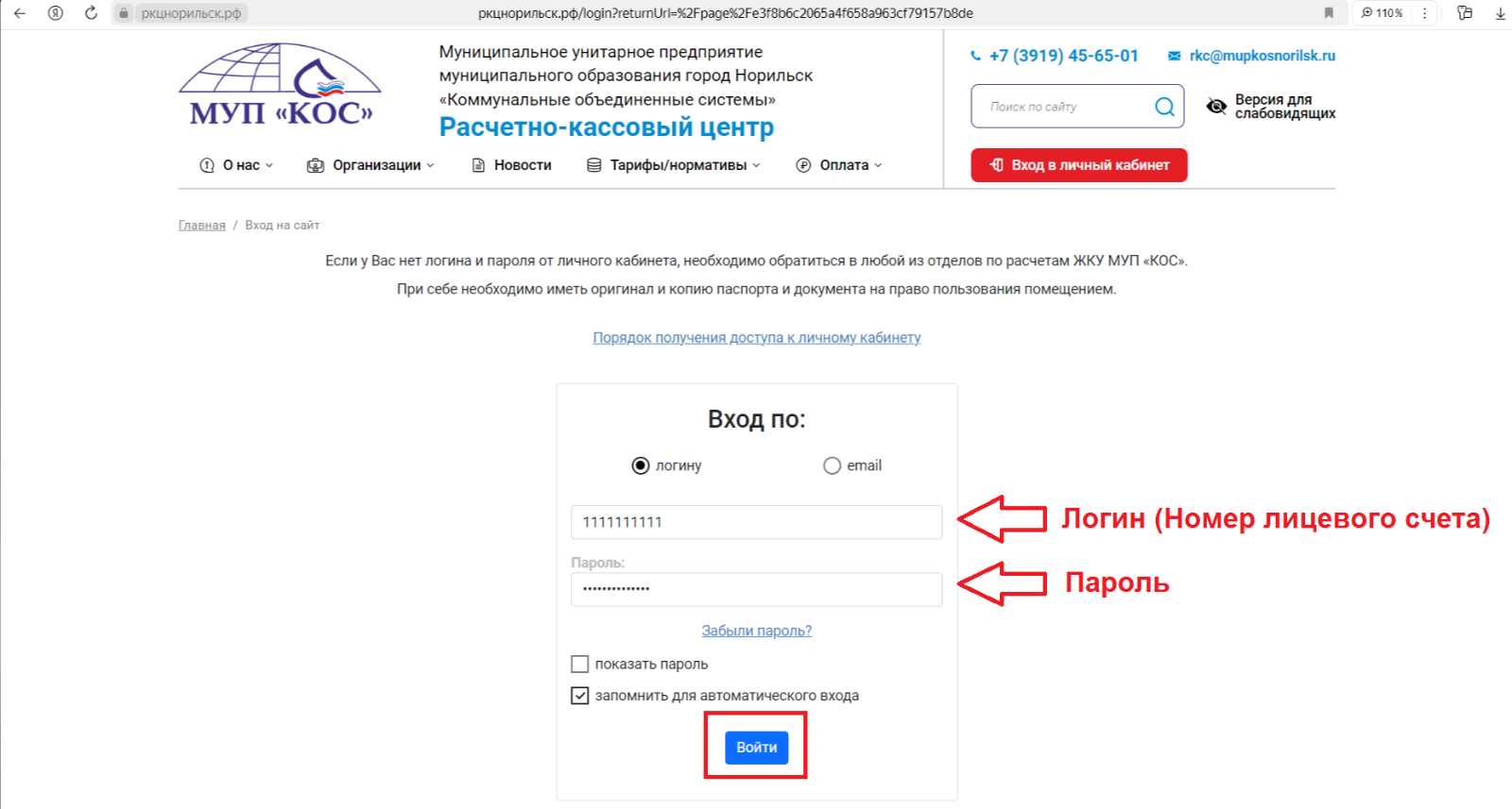 Введите логин и пароль в соответствующие поля и нажмите кнопку «Войти»: