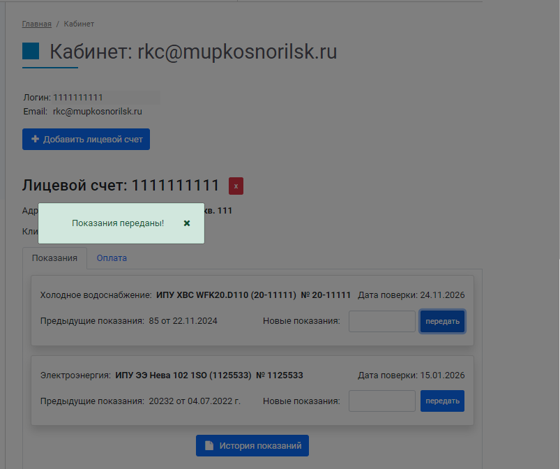 После нажатия на кнопку «Передать» будет выведено сообщение о том, что показания переданы успешно: