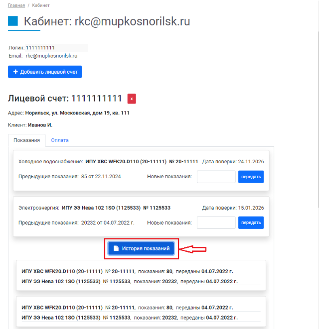 По нажатию на кнопку «История показаний» доступна история переданных ранее показаний: