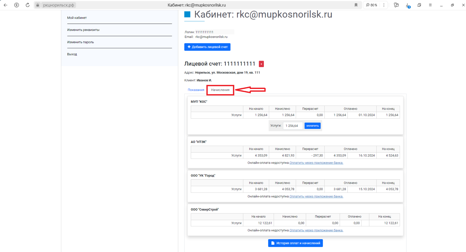 · «Начисления», где можно ознакомиться с единым платежным документом, посмотреть историю оплат и начислений за жилищно-коммунальные услуги.