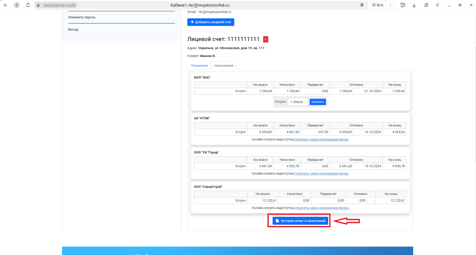 По нажатию на кнопку «История оплат и начислений» отображается информация о прошлых расчетных периодах: