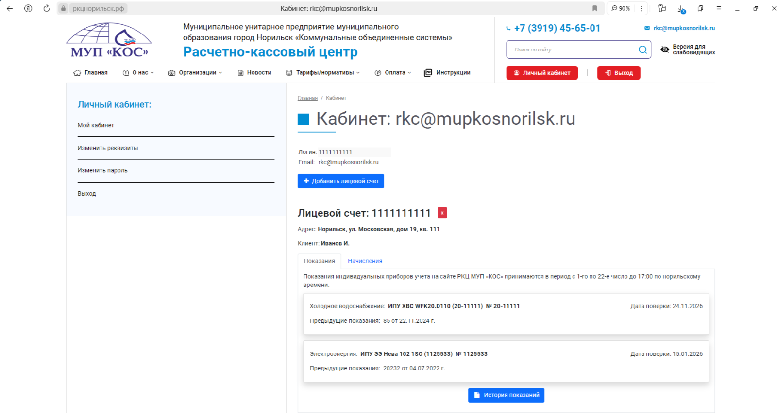 · «Показания», где доступна для просмотра информация об установленных в помещении индивидуальных приборов учета, в том числе история переданных показаний и даты следующих поверок. Также можно передавать показания индивидуальных приборов учета в период с 1-го по 22-е число до 17:00 по норильскому времени.